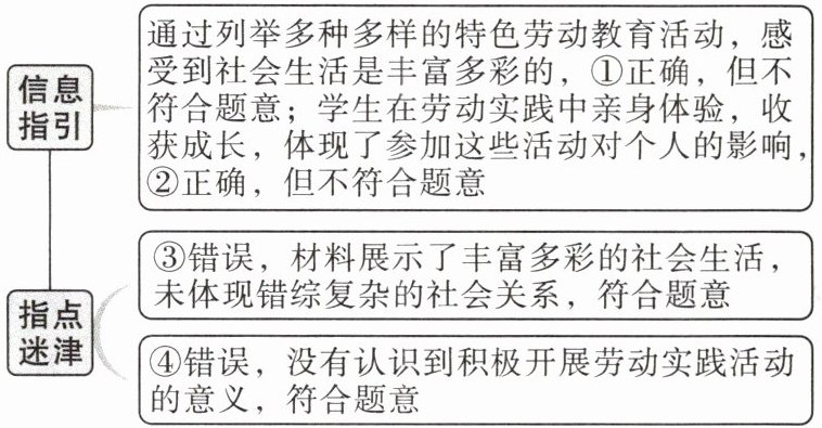 |信息指引|通过列举多种多样的特色劳动教育活动,感受到社会生活是丰富多彩的,①正确,但不符合题意;学生在劳动实践中亲身体验,收获成长,体现了参加这些活动对个人的影响,②正确,但不符合题意|