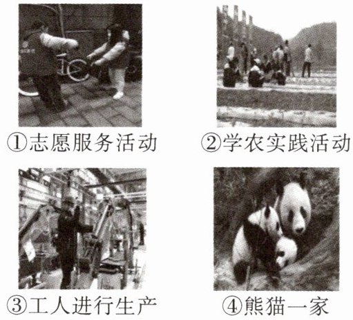 |①志愿服务活动②学农实践活动③工人进行生产④熊猫一家|