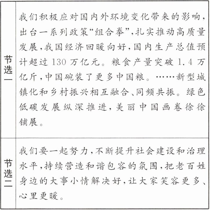 |节选一|我们积极应对国内外环境变化带来的影响,出台一系列政策“组合拳”,扎实推动高质量发展,我国经济回暖向好,国内生产总值预计超过130万亿元。粮食产量突破1.4万亿斤,中国碗装了更多中国粮。……新型城镇化和乡村振兴相互融合、同频共振。绿色低碳发展纵深推进,美丽中国画卷徐徐铺展。|