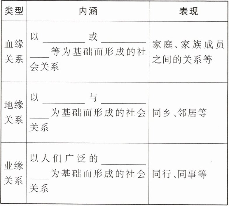 | 血缘关系 | 以______或______等为基础而形成的社会关系 | 家庭、家族成员之间的关系等 |