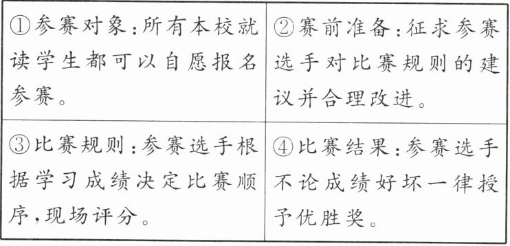 |①参赛对象:所有本校就读学生都可以自愿报名参赛。|②赛前准备:征求参赛选手对比赛规则的建议并合理改进。|