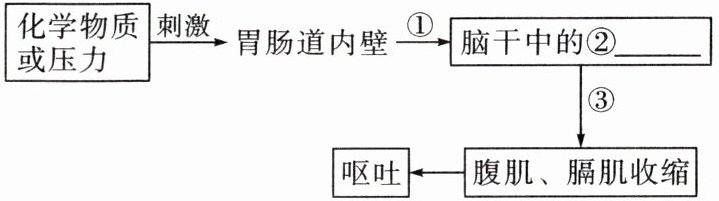 (2) 胃肠道内壁分布有感受化学物质和压力刺激的______,它们受到刺激后会产生神经冲动。神经冲动沿[①]传入神经传到脑干中的[②]______,再由[③]______传至胃、膈等部位中的______,引起相应反应,使胃及部分小肠内容物排出体外,完成呕吐动作。