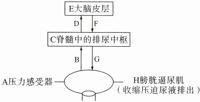 (2) 某人因车祸致使脊髓在颈部断裂,导致高位截瘫,排尿不受控制,排尿反射属于______(填反射的类型)。该患者排尿反射具体的反射弧是______(用图中字母和箭头表示)。正常人即使膀胱内尿液充盈,也只有在适宜情况下才会主动排尿,这体现了______。