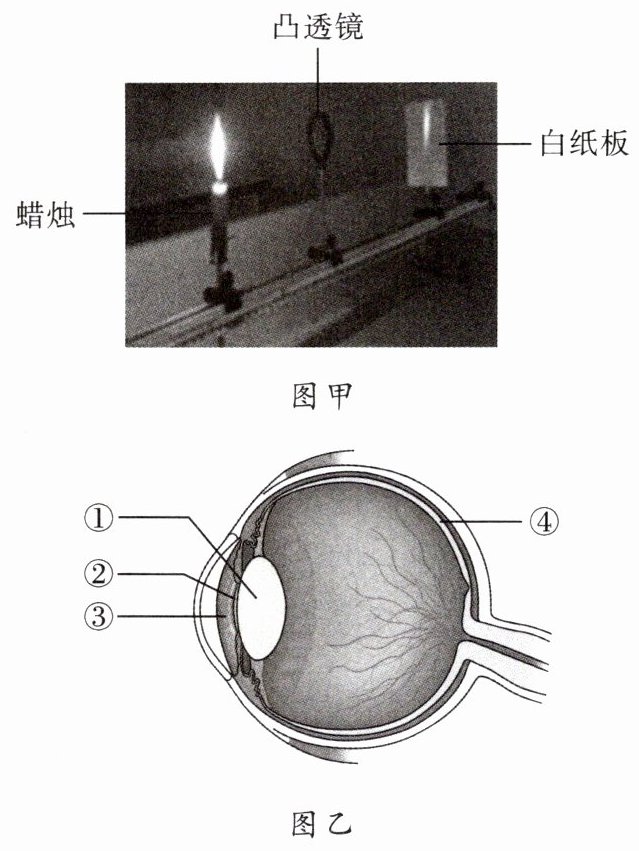 (1)按图甲固定好蜡烛和白纸板,调整凸透镜的位置,直到白纸板上出现一个清晰、倒立、缩小的物像。此过程中,白纸板模拟的是眼球的____(填图乙中序号)。再将蜡烛向左移动,模拟人看远处的物体,此时需要将透镜换成凸度稍____(填“大”或“小”)的凸透镜,白纸板上才能形成清晰的物像。