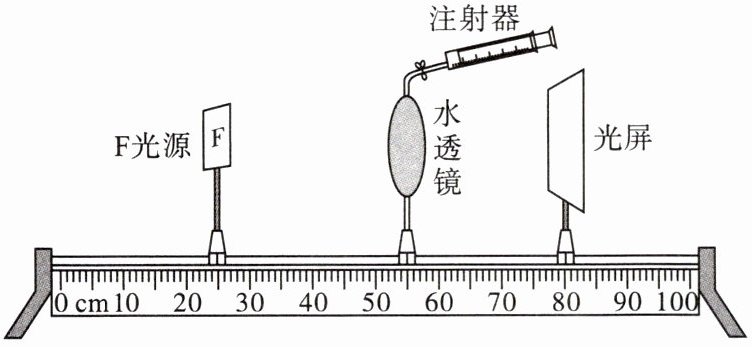 某学习小组利用光具座、可变焦的水透镜等器材,模拟人眼球成像原理,如下图所示(说明:注射器向水透镜内注水,曲度变大;向外抽水,曲度变小)。据图回答下列问题。