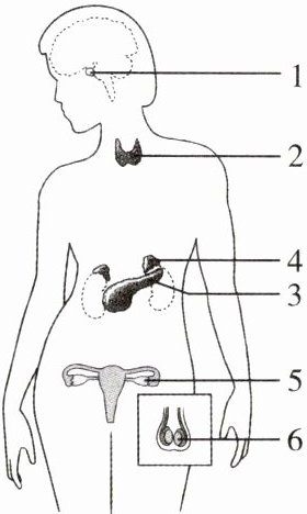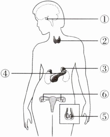 B 解析 题图中,①是垂体,②是甲状腺,③是肾上腺,④是胰岛(内分泌腺),⑤是睾丸,⑥是卵巢。垂体能分泌多种激素,A项错误。④胰腺中的胰岛能分泌胰岛素,而③是肾上腺,C项错误。多吃含碘的海产品可预防地方性甲状腺肿,D项错误。