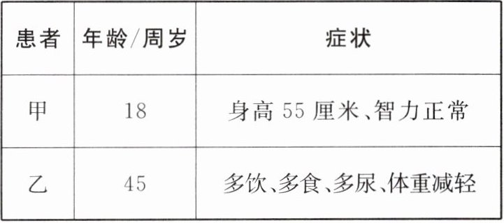 B 解析 分析题表可知,患者甲18周岁,身高55厘米,智力正常,这是典型的侏儒症的症状。侏儒症是由幼年时期垂体分泌的生长激素不足造成的。患者乙45周岁,多尿、多饮、多食、体重减轻,这是典型的糖尿病的症状,糖尿病是由胰岛素分泌不足造成的。