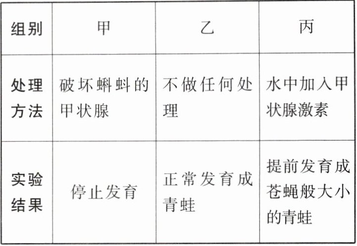 |实验结果|停止发育|正常发育成青蛙|提前发育成苍蝇般大小的青蛙|