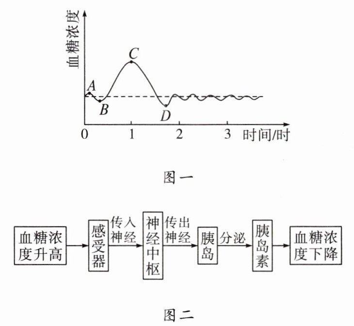 9. 糖类是重要的能源物质,随着健康意识的增强,人们越来越关注糖类对人体健康的影响。图一是正常人血糖浓度变化的曲线图;图二是人体内血糖浓度调节的部分过程示意图。请据图分析并回答下列问题。