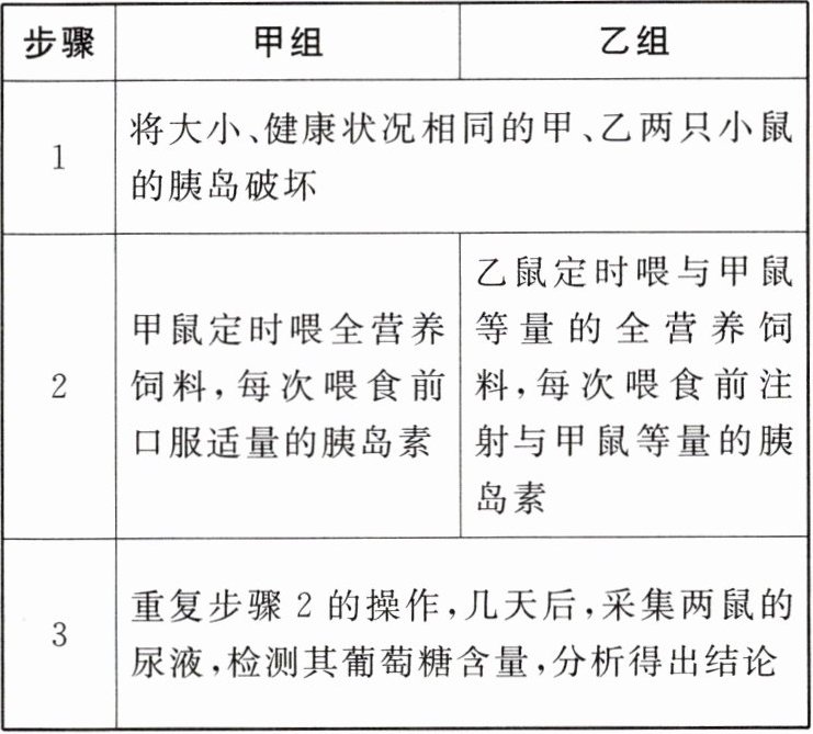 |2|甲鼠定时喂全营养饲料,每次喂食前口服适量的胰岛素|乙鼠定时喂与甲鼠等量的全营养饲料,每次喂食前注射与甲鼠等量的胰岛素|