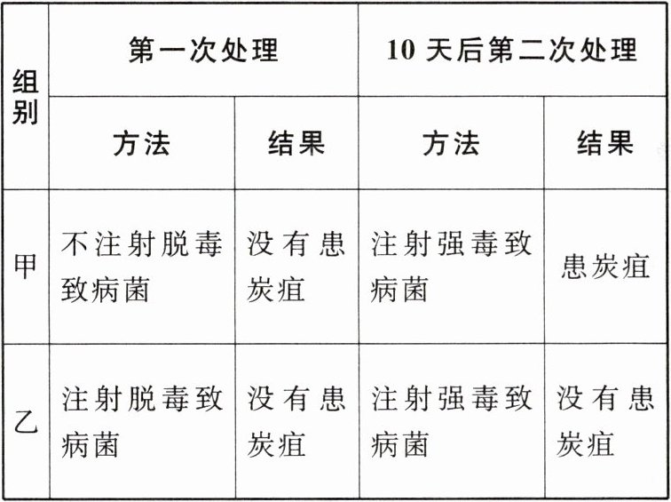 6. 炭疽是由炭疽杆菌引起的一种人畜共患的传染病。巴斯德在研究家畜炭疽时,选取多只生理状况相似的健康绵羊,平均分成2组,进行了一项著名的实验,实验方法和结果如下表所示。请回答下列问题。