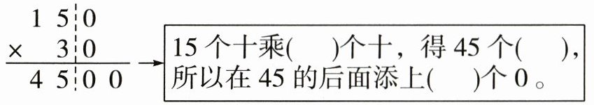 8. $\begin{array}{r}150\\×30\\\hline4500\end{array} $→15 个十乘( )个十,得 45 个( ),所以在 45 的后面添上( )个 0。