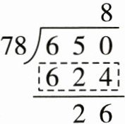 4. 乐乐家距离学校有650米,他每分钟步行78米,乐乐放学回家步行需要多少分钟?图中竖式虚线所圈的部分计算的是( )。