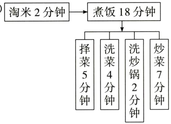 择菜:5 分钟 淘米:2 分钟 洗炒锅:2 分钟 煮饭:18 分钟 洗菜:4 分钟 炒菜:7 分钟