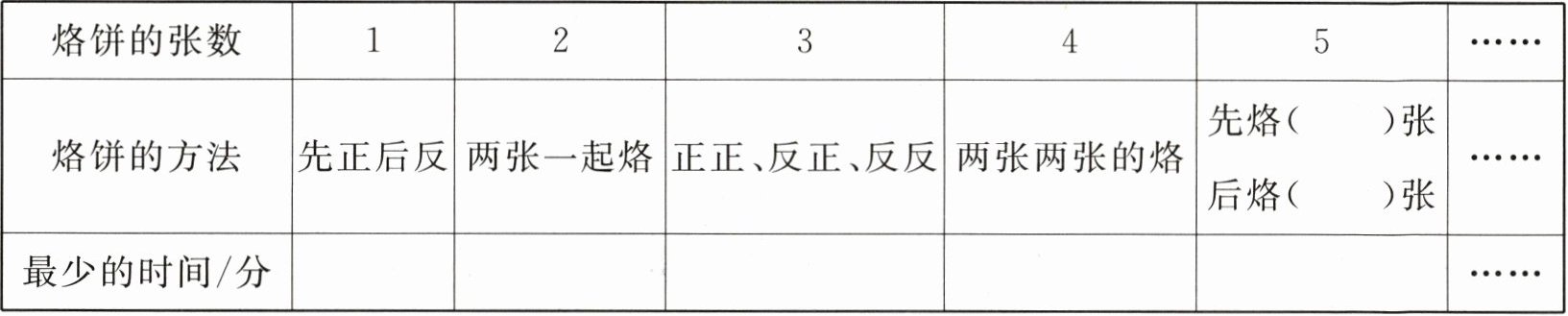 | 烙饼的方法 | 先正后反 | 两张一起烙 | 正正、反正、反反 | 两张两张的烙 | 先烙( )张后烙( )张 | …… |