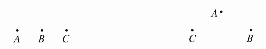 5. 如下面左图,经过$A$、$B$、$C$三个点可以画出( )条直线;如下面右图,经过$A$、$B$、$C$三个点中的任意两点,一共可以画出( )条直线。