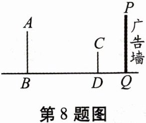 8. 如图,某一广告墙$PQ旁有两根直立的木杆AB和CD$,某一时刻在太阳光下,木杆$CD的影子刚好不落在广告墙PQ$上。