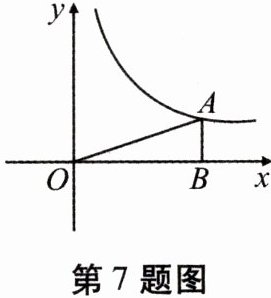 7. 如图,反比例函数 $ y = \frac{k}{x} $ 的图象经过点 $ A(4, b) $,过点 $ A $ 作 $ AB \perp x $ 轴于点 $ B $,$ \triangle AOB $ 的面积为 $ 2 $,求 $ k $ 和 $ b $ 的值及 $ OA $ 所在直线的函数表达式,