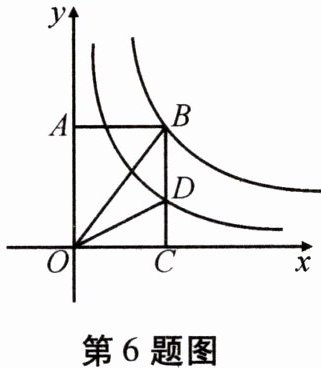 6. 如图,矩形 $ OABC $ 中,点 $ B $ 在反比例函数 $ y = \frac{6}{x} $ 的图象上,$ BC $ 边与反比例函数 $ y = \frac{k}{x}(k \neq 0) $ 的图象交于点 $ D $,若 $ \triangle BOD $ 的面积为 $ 2 $,则 $ k $ 的值为______