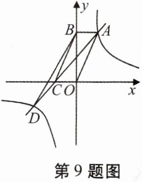 9. 如图,$□ OABC$ 中,$ AB = 2 $,$ OA = 2\sqrt{5} $,它的边 $ OC $ 在 $ x $ 轴的负半轴上,对角线 $ OB $ 在 $ y $ 轴的正半轴上。反比例函数 $ y = \frac{m}{x} $ 的图象经过点 $ A $,一次函数 $ y = kx + b $ 的图象经过 $ A $,$ C $ 两点且与反比例函数图象的另一支交于点 $ D $。