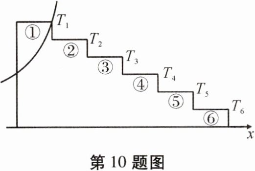 10. 如图,在x轴上方有①~⑥六个台阶,它们的拐角$ T_1 $~$ T_6 $处均为90°,每个台阶的高和宽分别是1和2个单位长度,若反比例函数 $ y = -\frac{12}{x} $ 的图象经过$ T_1 $,则反比例函数 $ y = \frac{10}{x} $ 的图象经过两个台阶的横面(与x轴平行的面,包括横面的两端点),这两个台阶是