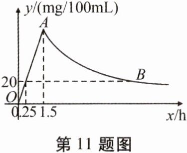 11. 实验数据显示,一般成年人喝50mL某品牌白酒后,血液中酒精含量y(mg/100mL)与时间x(h)之间的变化图象如图所示(由线段OA与反比例函数图象AB组成). 国家规定,车辆驾驶人员血液中的酒精含量大于或等于20(mg/100mL)时属于“酒后驾驶”,不能驾车上路.