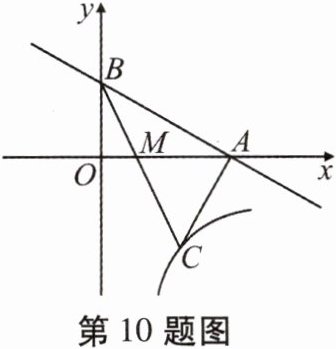 10. 如图,直线 $ y = -\frac{1}{2}x + 2 $ 与 $ x $ 轴、$ y $ 轴交于 $ A $,$ B $ 两点,$ C $ 为双曲线 $ y = \frac{k}{x}(k < 0,x > 0) $ 上一点,连接 $ AC $,$ BC $,且 $ BC $ 交 $ x $ 轴于点 $ M $,$ \frac{BM}{CM} = \frac{3}{4} $,若 $ \triangle ABC $ 的面积为 $ \frac{19}{3} $,则 $ k $ 的值为