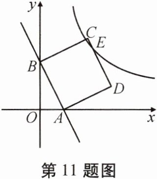11. 如图,直线 $ y = -2x + 2 $ 分别交 $ x $ 轴、$ y $ 轴于点 $ A $,$ B $,以 $ AB $ 为边作正方形 $ ABCD $,点 $ E $ 在 $ CD $ 边上,且 $ CE = \frac{1}{5}CD $,反比例函数 $ y = \frac{k}{x}(k \neq 0,x > 0) $ 的图象过点 $ E $,求 $ k $ 的值。