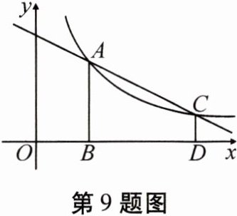 9. 如图,一次函数 $ y = kx + b $ 与反比例函数 $ y = \frac{m}{x} $ 的图象交于点 $ A(2,3) $,$ C $,线段 $ AB $,$ CD $ 都垂直于 $ x $ 轴,$ BD = 4 $。