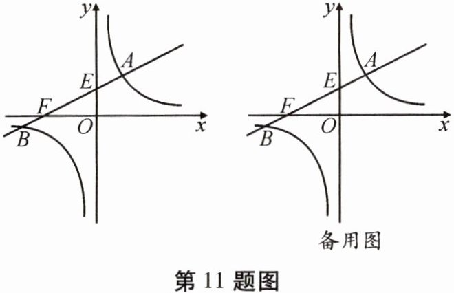 11. 如图,在平面直角坐标系 $ xOy $ 中,直线 $ y = \frac{1}{2}x + 2 $ 与 $ x $ 轴、$ y $ 轴分别交于 $ F $,$ E $ 两点,与反比例函数 $ y = \frac{k}{x} $ 的图象交于点 $ A(2,b) $ 和点 $ B $。