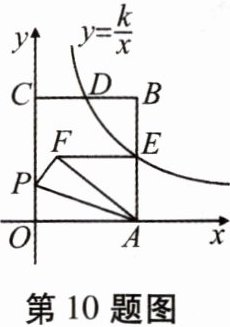 10. 如图,将矩形 $ OABC $ 置于一平面直角坐标系中,顶点 $ A $,$ C $ 分别位于 $ x $ 轴,$ y $ 轴的正半轴上,点 $ B $ 的坐标为 $ (5,6) $,双曲线 $ y = \frac{k}{x}(k \neq 0) $ 在第一象限中的图象经过 $ BC $ 的中点 $ D $,与 $ AB $ 交于点 $ E $,$ P $ 为 $ y $ 轴正半轴上一动点,把 $ \triangle OAP $ 沿直线 $ AP $ 翻折,使点 $ O $ 落在点 $ F $ 处,连接 $ FE $,若 $ FE // x $ 轴,则点 $ P $ 的坐标为