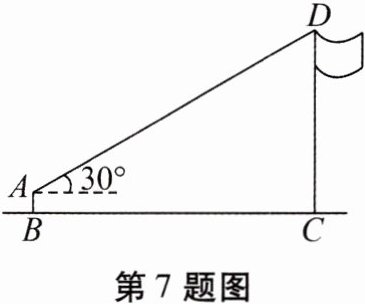 7. 如图,升国旗时,沈杰同学站在离旗杆24m处行注目礼,当国旗升到旗杆顶部时,测得该同学视线的仰角为30°,若该同学双眼离地面1.5m,则旗杆有多高?(结果精确到0.1m,参考数据:$\sqrt{3}≈1.73$)