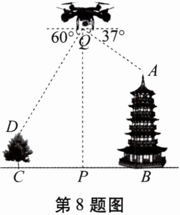 8. 为测得古塔的高度,某校数学社团开展实践活动。如图,塔AB与树CD之间的距离BC = 60米,点P为BC的中点,他们利用无人机在点P的正上方Q处悬停,测得塔顶A的俯角为37°,树顶D的俯角为60°,树CD的高为11米,求塔AB的高。(点A,B,C,D,P,Q在同一平面内,参考数据:$\sin37°≈0.60$,$\cos37°≈0.80$,$\tan37°≈0.75$,$\sqrt{3}≈1.73$)