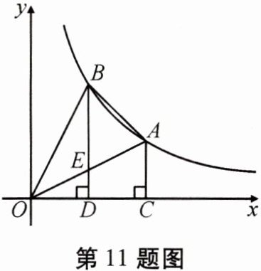 11. 如图,点 $ A $, $ B $ 是反比例函数 $ y = \frac{k}{x}(x > 0) $ 的图象上的点,过点 $ A $ 作 $ AC \perp x $ 轴,垂足为 $ C $,过点 $ B $ 作 $ BD \perp x $ 轴,垂足为 $ D $, $ OD = DC $,连接 $ AO $, $ BO $, $ AB $,线段 $ AO $ 交 $ BD $ 于点 $ E $, $ OA = \sqrt{5} $, $ \tan \angle AOC = \frac{1}{2} $.