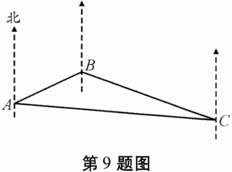 9. 如图,在一片海域中有三个岛屿,标记为 $ A $, $ B $, $ C $. 经过测量岛屿 $ B $ 在岛屿 $ A $ 的北偏东 $ 65^{\circ} $ 方向上,岛屿 $ C $ 在岛屿 $ A $ 的南偏东 $ 85^{\circ} $ 方向上,岛屿 $ C $ 在岛屿 $ B $ 的南偏东 $ 70^{\circ} $ 方向上.
