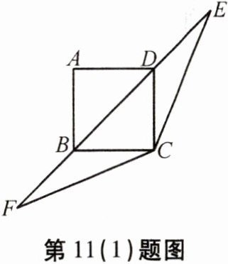 11. (1) 如图,点 $ E $, $ F $ 在正方形 $ ABCD $ 的对角线 $ BD $ 所在的直线上,且 $ \angle E + \angle F = 45^{\circ} $, $ ED = 2 $,设 $ BD = x $, $ BF = y $,求 $ y $ 与 $ x $ 之间的函数关系式;