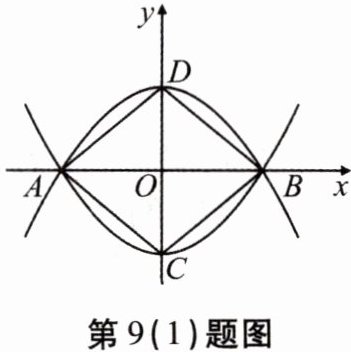 9. (1) 如图,抛物线 $ y = a x ^ { 2 } - 3 $ 和 $ y = - a x ^ { 2 } + 3 $ 都经过 $ x $ 轴上的 $ A $,$ B $ 两点,两条抛物线的顶点分别为 $ C $,$ D $. 当四边形 $ A C B D $ 的面积为 $ 24 $ 时,求 $ a $ 的值;