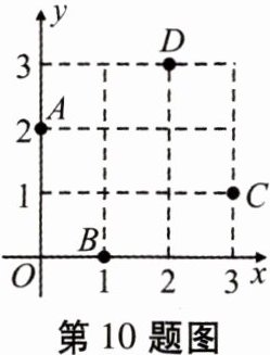 10. 如图,已知平面直角坐标系中的四个点:$ A(0,2) $,$ B(1,0) $,$ C(3,1) $,$ D(2,3) $。二次函数 $ y = ax^{2} + bx + c $ 的图象经过其中任意三个点,当 $ a $ 的值最大时,二次函数的表达式为