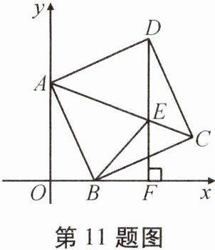 11. 如图,在平面直角坐标系中,正方形ABCD的顶点A,B分别在y轴正半轴、x轴正半轴上,过点D作$DF⊥x$轴于点F,交对角线AC于点E,连接BE.