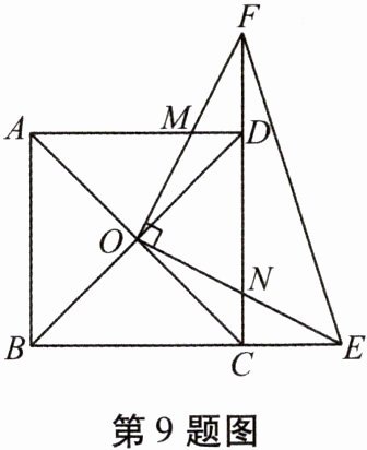 9. 如图,正方形ABCD的对角线AC,BD交于点O,M,N分别是AD,CD上的动点,且$∠MON = 90^{\circ}$,OM,ON的延长线分别与CD,BC的延长线交于点F,E,连接EF.