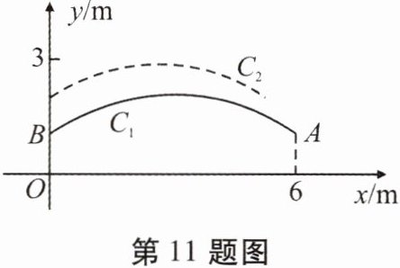 11. 如图,在平面直角坐标系中,一个单位长度代表1m长。嘉嘉在点$ A(6,1) $处将沙包(看成点)抛出,其运动路线为抛物线$ C_{1}:y = a(x - 3)^{2} + 2 $的一部分,淇淇恰在点$ B(0,c) $处接住,然后跳起将沙包回传,其运动路线为抛物线$ C_{2}:y = -\frac{1}{8}x^{2} + \frac{n}{8}x + c + 1 $的一部分。