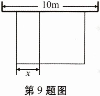 9. 如图,某农场计划建造一个矩形养殖场,为充分利用现有资源,该矩形养殖场一面靠墙(墙的长度为10m),另外三面用栅栏围成,中间再用栅栏把它分成两个面积比为1:2的矩形,已知栅栏的总长度为24m,设较小矩形的宽为xm。