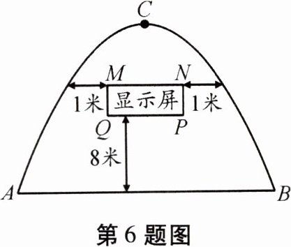 6. 如图,为了提醒司机安全驾驶,要在隧道中安装电子显示屏. 已知隧道截面为抛物线型,水平路面宽$AB = 16$米,抛物线顶点$C到AB的距离为12$米. 矩形显示屏$MNPQ的高MQ为1$米,根据计划,为了确保行车安全,显示屏底部距离地面至少$8$米,若距离左、右墙壁各留至少$1$米的维修空间,则该矩形显示屏$MNPQ的宽QP$的最大长度为