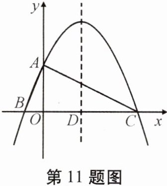 11. 如图,已知二次函数 $ y = -\frac{1}{4}x^{2} + \frac{3}{2}x + 4 $ 的图象与 $ y $ 轴交于点 $ A $,与 $ x $ 轴交于 $ B,C $ 两点,其对称轴与 $ x $ 轴交于点 $ D $,连接 $ AC,AB $。