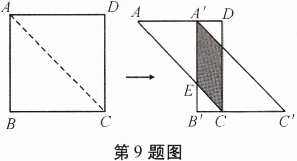 9. 如图,将边长为6的正方形ABCD沿其对角线AC剪开,再把△ABC沿着AD方向平移,得到△A'B'C',当两个三角形重叠部分的图形面积为9时,求△ABC平移的距离AA'。