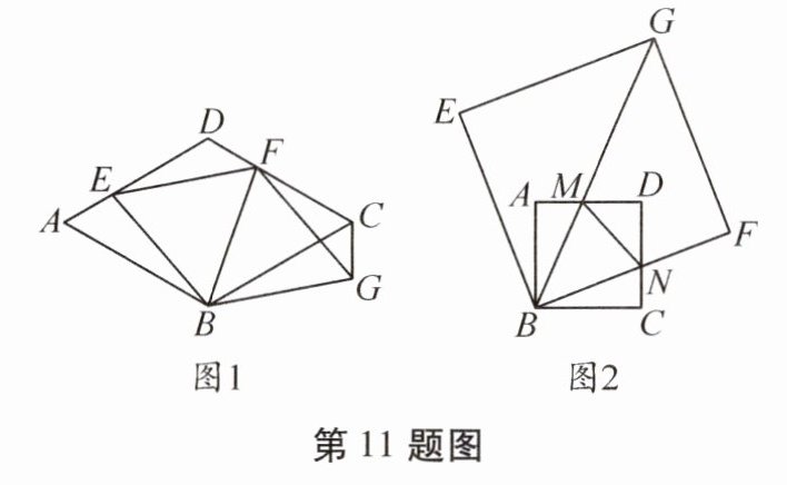 11. (1) 如图1,在菱形ABCD中,∠A= 60°,点E,F分别在边AD,CD上,连接BE,BF,EF,∠EBF= 60°,将△ABE绕点B顺时针旋转得到△CBG,连接FG,求证:EF= GF;