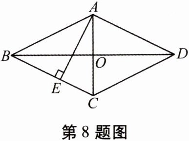 8. 如图,菱形 $ABCD$ 的对角线 $AC$,$BD$ 相交于点 $O$,过点 $A$ 作 $AE \perp BC$ 于点 $E$,若 $OB = 2$,$S_{菱形ABCD} = 4$,求 $AE$ 的长。