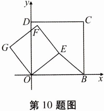 10. 如图,在平面直角坐标系中,点$B$、点$D分别在x$轴、$y$轴上,正方形$OBCD和正方形OEFG的边长分别为6和4$,连接$BE$,正方形$OEFG绕点O$旋转,当$C$,$G$,$F$三点共线时,$BE$的长为