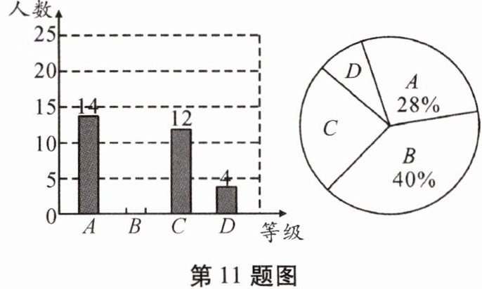 11. 某校为了解本校九年级学生足球训练情况,随机抽查该年级若干名学生进行测试,然后把测试结果分为4个等级:A,B,C,D,并将统计结果绘制成如图所示两幅不完整的统计图。