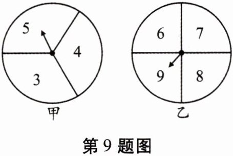 9. 在一次数学兴趣小组活动中,李燕和刘凯两位同学设计了如图所示的两个转盘做游戏(每个转盘被分成面积相等的几个扇形,并在每个扇形区域内标上数)。游戏规则如下:两人分别同时转动甲、乙转盘,转盘停止后,若指针所指区域内两数之和小于12,则李燕获胜;若指针所指区域内两数之和等于12,则为平局;若指针所指区域内两数之和大于12,则刘凯获胜。(若指针停在等分线上,则重转一次,直到指针指向某一区域为止)